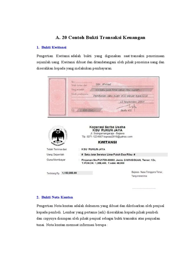 20 contoh bukti transaksi keuangan. Bukti transaksi nota retur · 5. Kenali jenis dan contoh bukti transaksi yang digunakan . Contoh bukti transaksi ekstern adalah faktur, nota, cek, kuitansi, bukti pengeluaran kas, bukti penerimaan kas, bukti penjualan, dan bukti . Bukti transaksi · kwitansi · nota kontan · faktur (invoice) · nota kredit · nota debet · cek (cheque) · rekening koran · bilyet giro.